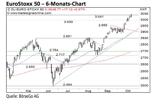 Trotz der steilen Kaufwelle der letzten Tage scheinen die Käufer beim EuroStoxx 50 Index nicht müde zu werden. Vielmehr könnten sie bereits den nächsten Ausbruch vorbereiten. Die Long-Szenarien: Kann der Index in den kommenden Tagen über der 3.041 Punkte-Marke verbleiben, dürfte sich die Rally des Wertes bis 3.100 Punkte fortsetzen. Auf diesem Niveau wäre mit einer kurzfristigen Gegenbewegung zu rechnen. Sollte diese Barriere im Anschluss dem Ansturm der Bullen ebenfalls zum Opfer fallen, könnte der Aufwärtstrend mittelfristig bis 3.180 Punkte führen. Die Short-Szenarien: Ein Rücksetzer ausgehend von 3.041 Punkten könnte dagegen bereits bei 3.000 Punkten wieder auf Käufer treffen. Wird diese Unterstützung unterschritten, dürfte das Zwischenhoch bei 2.955 Punkten angelaufen werden. Auch hier würde sich den Käu- fern die Chance auf eine weitere Aufwärtsbewegung bieten. Bricht der Index dagegen unter 2.955 Punkte ein, könnte es zu deutlicheren Abgaben bis 2.895 und 2.851 Punkte kommen, ehe sich der EuroStoxx auf diesem Niveau stabilisieren dürfte. Wird die 2.851 Punkte-Marke dagegen durchbrochen, wäre mit einem massiven Ausverkauf bis 2.754 Punkte zu rechnen.