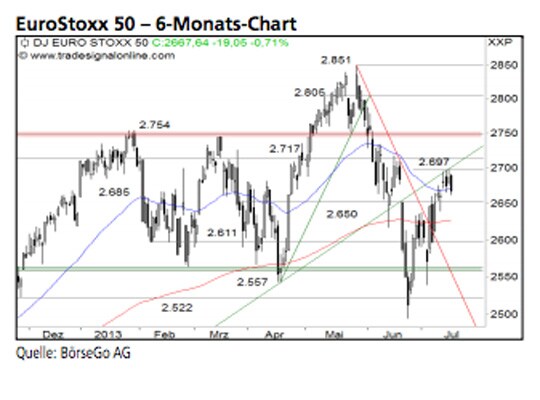 Ausblick: Die Bullen im EuroStoxx 50 Index stehen vor einer Bewährungsprobe. Die charttechnischen Widerstände zeigen Wirkung. Wichtige Unterstützungen sind aber ebenfalls noch intakt. Die Long-Szenarien: Ein Anstieg über die im Juni aufgegebene mittelfristige Aufwärtstrendlinie wäre vonnöten, damit der EuroStoxx 50 Index seine Erholungsbewegung fortsetzen könnte. Gelingt den Bullen dieser Kraftakt mit Kursen oberhalb von 2.697 Punkten, wäre der Weg für weitere Kursgewinne bis zum Widerstand bei 2.717 Punkten frei. Wird auch dieser Widerstand überwunden, dürfte das Hoch aus dem Januar bei 2.754 Punkten wieder in den Fokus der Anleger rücken. Die Short-Szenarien: Ein Test der Unterstützung bei 2.650 Punkten wäre aus Sicht der Bullen noch unproblematisch. Erst wenn der EuroStoxx 50 Index diese Marke aufgibt, müssten Abgaben bis auf 2.611 Punkte einkalkuliert werden. Fällt der Index auch unter diese Unterstützung, droht das komplette Ende der Erholungsbewegung und Kurse um 2.500 Punkte.