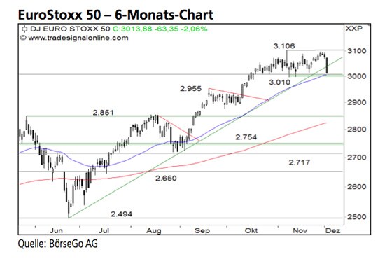 Rückblick: Der EuroStoxx 50 Index stieg in den vergangenen Wochen in einer geradlinigen Aufwärtsbewegung über die Widerstände bei 2.851 und 2.955 Punkten und markierte Anfang November mit 3.106 Punkten ein neues Jahreshoch.