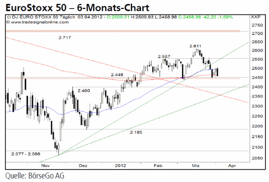 Ausblick: Die Erholung seit dem Test der Unterstützung bei 2.448 Punkten wurde mit dem gestrigen Ausverkauf beendet. Ein erneuter Test, wenn nicht sogar ein Durchbruch dieses Niveaus sollte daher eingeplant werden. Die Short-Szenarien: Der EuroStoxx 50 Index bekam die Stärke der Verkäufer mit Bruch der mittelfristigen Aufwärtstrendlinie zu spüren. Ein weiterer Etappensieg könnte nun mit Unterschreitung der Unterstützung bei 2.448 Punkten erfolgen, welche man unserer Einschätzung nach „short“ handeln könnte. Das nächste Korrekturziel befindet sich dann bei 2.400 Punkten, bevor darunter ein Test der seit September des letzten Jahres etablierten Aufwärtstrendlinie, die aktuell bei 2.360 Punkten verläuft, anstehen könnte. Dort sollte sich der Index spätestens stabilisieren, um nicht eine mittelfristige Trendwende einzuleiten. Die Long-Szenarien: Nur eine erneute Stabilisierung auf aktuellem Niveau könnte dem Index die Chance eröffnen, das aktivierte Verkaufssignal umzukehren. Zur Reaktivierung der Käufer müsste der Index allerdings noch über die Marke von 2.557 Punkten ansteigen. Gelingt dies, könnten sich damit weitere Zugewinne bis 2.611 und darüber 2.717 Punkte erschliessen.