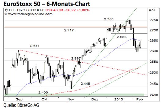 Rückblick: Der EuroStoxx 50 Index beendete Ende Januar vor- erst seinen mehrwöchigen Aufwärtstrend mit einem kurzfristigen Doppelhoch am Widerstand...