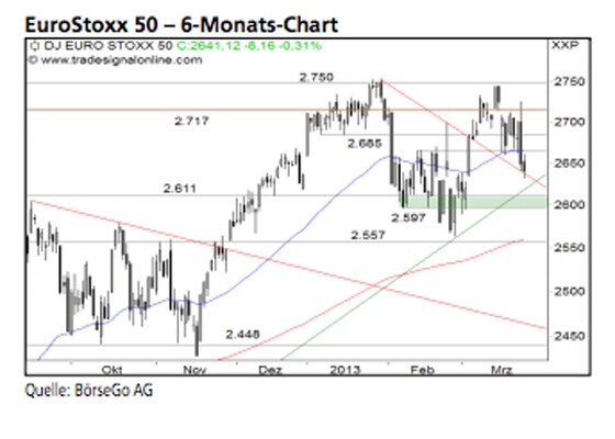 Rückblick: Ende Februar bildete der EuroStoxx 50 Index im Bereich der Kreuzunterstützung bei 2.557 Punkten einen Boden aus und stieg in der Folge über den Widerstand bei 2.685 Punkten an.