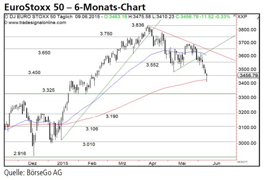 Rückblick: Mit einem neuen Jahreshoch bei 3.836 Punkten endete der monatelange Aufwärtstrend des EuroStoxx 50 Index im April und der Wert setzte in einer ersten Korrekturwelle an die Unterstützung bei 3.456 Punkten zurück.