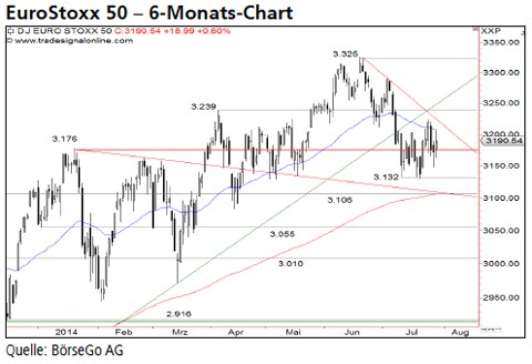 Rückblick: Mitte Juni setzte beim EuroStoxx 50 Index eine Korrekturbewegung ein, die zu einem Bruch der Unterstützung bei 3.239 Punkten führte.