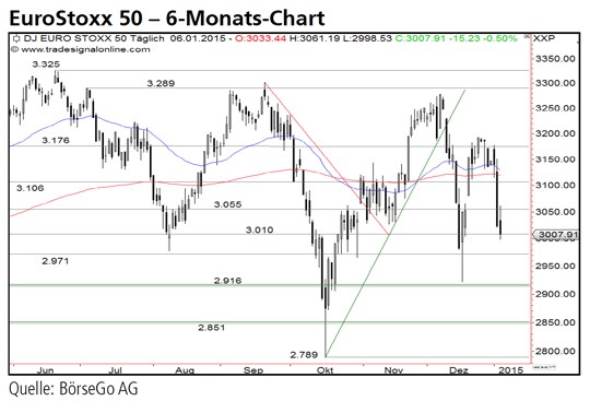 Rückblick: Der EuroStoxx 50 Index scheiterte Anfang Dezember letzten Jahres zum zweiten Mal am Widerstand bei 3.289 Punkten und brach daraufhin in einer steilen Verkaufswelle bis an die Unterstützung bei 2.916 Punkten ein.