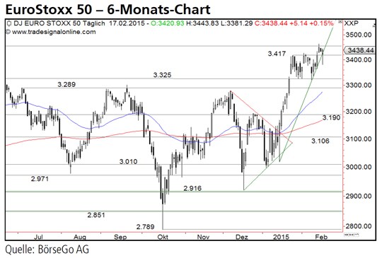Rückblick: Der EuroStoxx 50 Index stieg Mitte Januar in einer steilen Kaufwelle über das bisherige Verlaufshoch bei 3.325 Punkten an und beendete damit einen mehrmonatigen Seitwärtsmarkt.