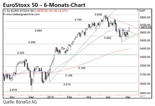 Rückblick: Seit der Ausbildung eines neuen Jahreshochs bei 3.836 Punkten ging der EuroStoxx 50 Index in eine Korrekturphase über, die ihn nach dem Unterschreiten der Unterstützung bei 3.650 Punkten bis in den Bereich der Haltemarke bei 3.456 Punkten zurückführte.