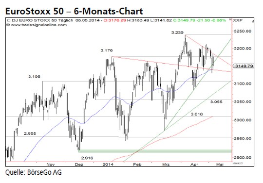 Rückblick: Der EuroStoxx 50 Index erreichte Anfang April ein neues Verlaufshoch bei 3.239 Punkten und konnte sich mit diesem Kaufimpuls kurzzeitig aus dem vorherigen Seitwärtsmarkt befreien.