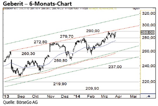 Ausblick: Der langfristige Aufwärtstrend der Aktien ist ungefährdet, kurzfristig scheint der Kurs jedoch etwas gedeckelt. Ein Kraftakt der Bullen ist nötig, um nachhaltig neue Hochs zu erreichen. Die Long-Szenarien: Die Aktien nähern sich dem Allzeithoch bei 290,00 CHF an, das den zentralen kurzfristigen Widerstand bildet. Ein Ausbruch über diese Marke würde ein Kaufsignal mit sich bringen. Allerdings ist im Chart ebenfalls gut eine mittelfristige Trendlinie zu erkennen, die den Kurs eindämmt. Erst über 292,00 CHF wäre demnach für die Aktien von Geberit der Weg zur runden Marke von 300,00 CHF frei. Aus einer Trendkanalprojektion lässt sich oberhalb von 300,00 CHF bereits jetzt ein Kursziel von 320,00 CHF ableiten. Spätestens dort dürfte es voraussichtlich zu einer längeren Verschnaufpause kommen. Die Short-Szenarien: Oberhalb der bestimmenden Aufwärtstrends hätten die Aktien auch durchaus grösseren Konsolidierungsspielraum. Ein kleines Verkaufssignal wäre aktiv, sollte die Horizontale bei 279,79 CHF unterschritten werden. Abgaben bis 272,80 CHF, im besten Fall für die Bären sogar auf die Kreuzunterstützung bei 260,00 CHF wären im Anschluss denkbar. Allerdings dürften die Aktien spätestens in diesem Kursbereich wieder nach oben drehen.