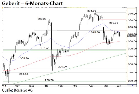 Ausblick: Die Aktien von Geberit befinden sich seit April in einem Abwärtstrend. Eine Fortsetzung der laufenden Erholung ist aus unserer Sicht nicht ohne eine vorherige Abwärtskorrektur möglich. Die Long-Szenarien: Zunächst dürfte die angesprochene Gegenbewegung einsetzen und den Wert an die 332,50 CHF-Marke drücken. Doch auf diesem Niveau sollten sich die Käufer wieder sammeln und einen weiteren Aufwärtsimpuls auslösen. Führt dieser zu einem Bruch der 345,00 CHFMarke, wäre ein kurzfristiges Kaufsignal aktiv und ein Anstieg bis an den Widerstandsbereich von 359,00 bis 362,20 CHF wahrscheinlich. Dort dürften die Bären erneut aktiv werden und einen weiteren Ausverkauf auslösen. Sollte diese Kurszone dagegen überwunden werden, stünde bereits ein Angriff auf das Jahreshoch bei 371,90 CHF an. Die Short-Szenarien: Bei einem Rückfall unter die 332,50 CHF-Marke wäre die Erholung dagegen beendet und ein Einbruch bis 318,90 CHF die Folge. Diese Unterstützung sollte jedoch zu einer Bodenbildung genutzt werden. Setzen die Aktien dagegen auch unter diese Marke zurück, dürfte ein Ausverkauf bis 295,00 CHF folgen.