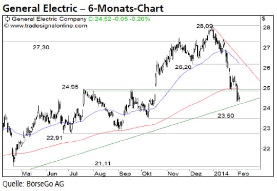 Ausblick: Sollten die Aktien von General Electric jetzt unter die seit dem Oktober 2011 gültige Aufwärtstrendlinie fallen, wäre mit einer mittelfristigen Fortsetzung des Ausverkaufs zu rechnen. Die Short-Szenarien: Unterhalb der 24,95 USDMarke ist der Abwärtstrend seit Januar uneingeschränkt intakt und dürfte zu einem Bruch der Trendlinie führen. In der Folge könnten die Aktien weiter bis an die Unterstützung bei 23,50 USD zurücksetzen. Dort wäre mit einer vorübergehenden Erholung zu rechnen. Sollte die Marke im Anschluss jedoch ebenfalls gebrochen werden, sind auf Sicht der kommenden Wochen Verluste bis 21,11 USD möglich. Die Long-Szenarien: Bei einer Verteidigung der Trendlinie könnten die Aktien dagegen an die Hürde bei 24,95 USD steigen. Darüber wäre eine Ausweitung der Erholung bis 25,62 und 26,20 USD wahrscheinlich. Allerdings könnte diese starke Kurshürde einen weiteren Abwärtsimpuls nach sich ziehen. Letztlich wäre erst ein nachhaltiger Ausbruch über diese Marke bullish zu werten und würde für Zugewinne bis 27,30 USD sprechen.
