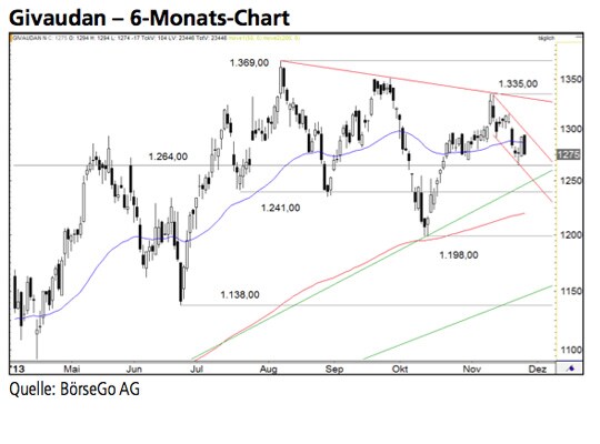 Ein kurzfristiges Doppeltief sorgte Mitte Oktober jedoch wie- der für zunehmenden Kaufdruck und die Aktien stiegen in der Folge über die 1.241,00 CHF-Marke und schliesslich auch über den Widerstand bei 1.264,00 CHF an. In der Spitze haussierte der Wert an die kurzfristige, seit dem Allzeithoch vorherrschende Abwärtstrendlinie.