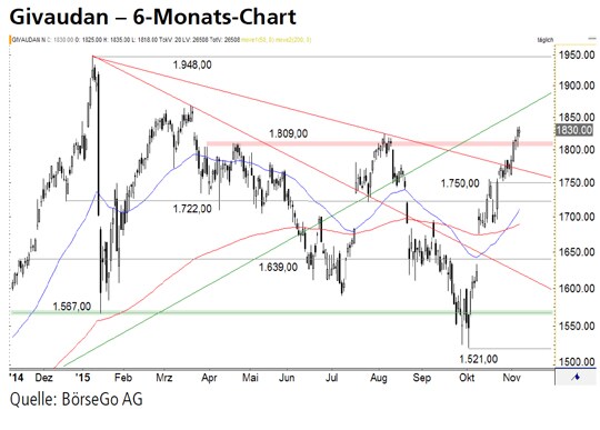 Rückblick: Die Aktien von Givaudan brachen nach einem neuen Allzeithoch im Dezember 2014 bei 1.948 CHF zunächst massiv ein und konnten sich auch in den folgenden Monaten von diesem Ausverkauf nicht erholen.