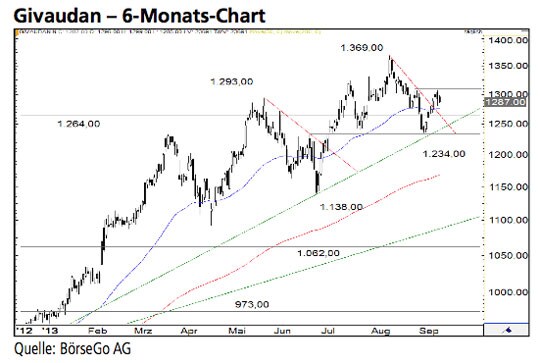 Rückblick: Nach einem Anstieg an die Hürde bei 973,00 CHF im Juli 2012 konsolidierten die Aktien von Givaudan diese Kaufwelle in einem bullishen Dreieck. Die Formation...