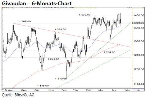 Rückblick: Ausgehend vom damaligen Allzeithoch bei1.369,00 CHF korrigierten die Aktien von Givaudan ab August2013 den vorherigen steilen Aufwärtstrend in einer stark volatilenGegenbewegung.