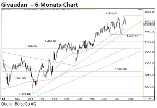 Rückblick: Nach einem Verlaufshoch bei 1.369,00 CHF im August 2013 gingen die Aktien von Givaudan in eine volatile, flaggenförmige Korrektur über.