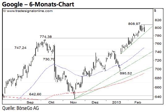 Die Kaufwelle der letzten Wochen hat die Aktien von Google wieder in den langfristigen Aufwärtstrend zurück- geführt. Eine Fortsetzung der Rally ist daher zu präferieren. Die Long-Szenarien: Steigen die Aktien über das derzeitige Allzeit- hoch bei 808,97 USD an, könnte sich der Kaufimpuls direkt bis 825,00 USD ausdehnen. Ausgehend von diesem Niveau könnte es zu einem Rücklauf an die jetzige Rekordmarke kommen. Kann der Wert im Anschluss auch über den Bereich des rechnerischen Kursziels bei 825,00 USD ausbrechen, könnte sich die Hausse auf mittlere Sicht bereits bis 850,00 USD fort- setzen. Die Short-Szenarien: Kann das Hoch bei 808,97 USD dagegen nicht durchbrochen werden, wäre mit einem kurz- zeitigen Rücklauf an die Ausbruchsmarke bei 774,38 USD zu rechnen, ehe sich der Aufwärtstrend von dort aus fortsetzen dürfte. Sollte diese Kreuzunterstützung dagegen unterschritten werden, kann die Korrektur bis zur Haltemarke bei 747,24 USD zurückführen. Selbst eine vorübergehende Ausweitung bis 730,70 USD wäre in diesem Fall denkbar. Spätestens auf diesem Niveau müssten die Bullen erneut in das Geschehen eingreifen und zumindest eine Stabilisierung auslösen. Ansonsten würde ein Einbruch bis 695,52 USD drohen.