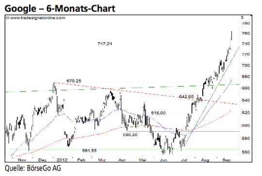 Rückblick: Im gestrigen Handel brachen die Aktien von Google im Rahmen einer enorm steilen Aufwärtsbewegung auf ein neues Allzeithoch bei 764,89 USD aus. Den Ausgangspunkt für diese gewaltige Kaufwelle lieferte...