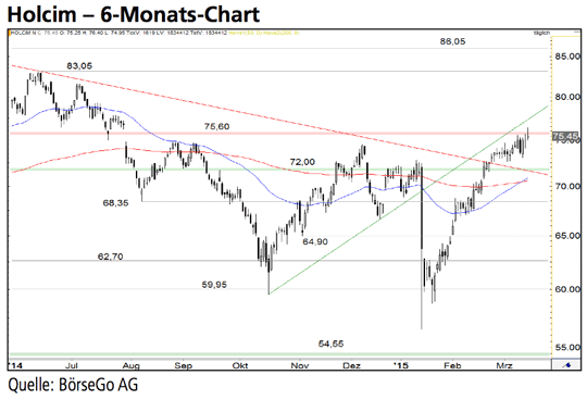 Rückblick: Nachdem die Aktien von Holcim im April 2014 über den Widerstand bei 75,60 CHF ausgebrochen waren, setzte sich der damalige Aufwärtstrend bis 86,05 CHF fort.