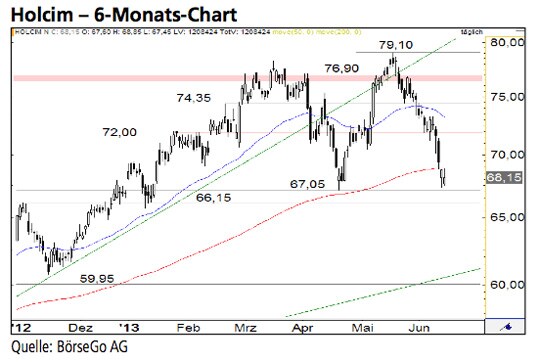 Der schnelle Abverkauf seit Mai trifft damit auf eine markante Unterstützung. Die Möglichkeit auf eine technische Gegenreaktion ist gegeben. Die Long-Szenarien: Die Bullen sind jetzt gefordert und müssen im Bereich des Apriltiefs bei 67,05 CHF eine Wende einleiten. Ein Rebound zunächst an den Widerstand bei 72,00 CHF sollte in diesem Fall machbar sein. Oberhalb dieser Hürde würde sich das Chartbild verbessern und Ziele bei 74,35 und 76,90 CHF werden erreichbar. Dar- über spräche nur mehr das bisherige Verlaufshoch bei 79,10 CHF gegen eine weitere Fortsetzung der Aufwärtsbewegung und ein Erreichen des 2010er-Hochs bei 85,00 CHF. Die Short- Szenarien: Unterschreiten die Aktien von Holcim dagegen die Unterstützungen bei 67,05 und 66,15 CHF nachhaltig, würde sich das Chartbild eintrüben. Ein Doppelhoch würde in diesem Fall auf einen Test der Kreuzunterstützung bei 60,00 CHF hin- weisen. Spätestens dort wäre eine Wiederaufnahme des langfristigen Aufwärtstrends sehr wahrscheinlich.