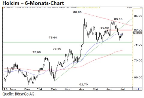 Rückblick: Nachdem sie im Frühjahr 2013 trotz zweier Ausbruchsversuchean der langfristigen Hürde bei 76,90 CHF gescheitertwaren, fielen die Aktien von Holcim bis September2013 an die Unterstützung bei 62,70 CHF zurück.
