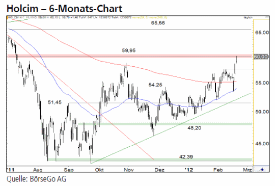 Ausblick: Die Bullen der Holcim Aktien stehen aktuell kurz vor der Vollendung eines weiteren Kaufsignals, welches nach unserer Auffassung einen deutlichen Kurssprung auslösen könnte. Die Long-Szenarien: Ein Anstieg über 59,95 CHF würde ein mittelfristiges Kaufsignal auslösen, welches man entsprechend „long“ handeln könnte. In dessen Folge dürfte eine dynamischen Kaufwelle bis 65,56 CHF führen. Die ehemalige Unterstützungsmarke dürfte nicht ohne weiteres zu überwinden sein und könnte eine erste Korrektur auslösen. Sollte hingegen auch ein direkter Ausbruch über diese Hürde gelingen, sind weitere Aufwärtsimpulse bis 70,00 CHF zu erwarten. Die Short-Szenarien: Würde dagegen der laufende Aufwärtstrend vorzeitig bereits an der 59,95 CHF-Marke enden, wäre eine vorübergehende Korrektur bis 56,30 CHF wahrscheinlich. Nach unserer Einschätzung könnte sich der Aufwärtstrend bereits von dieser Unterstützung aus fortsetzen. Wird die Marke hingegen durchbrochen, wäre von einer ausgiebigeren Abwärtsbewegung bis 54,25 und 53,50 CHF auszugehen. Bearish wäre dagegen erst ein nachhaltiger Bruch der Haltemarke bei 51,45 CHF zu werten. Einem Bruch dieser Kursregion dürfte ein Rückfall auf 42,39 CHF folgen.