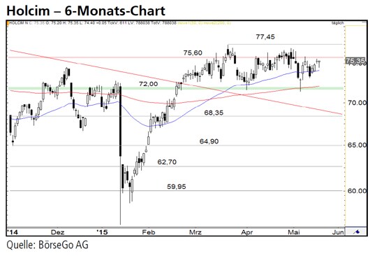 Ausblick: Kann sich der laufende kurzfristige Aufwärtsimpuls fortsetzen, dürften die Aktien von Holcim den Höhenflug seit Mitte Januar fortsetzen. Selbst ein übergeordneter Trendwechsel wäre dann denkbar. Die Long-Szenarien: Steigt der Wert jetzt über die 75,60 CHF-Marke an, würde die 77,45 CHFMarke direkt attackiert. Ein Ausbruch über diesen Widerstand hätte ein starkes Kaufsignal und eine Trendbeschleunigung zur Folge. Kurzfristig würde die 83,05 CHF-Marke angelaufen. Darüber könnte die Rally bis an das Vorjahreshoch bei 86,05 CHF führen. Die Short-Szenarien: Bei Kursen oberhalb der Unterstützung bei 72,00 CHF bleiben die Chancen der Bullen gewahrt. Erst ein Ausverkauf unter diese Marke würde die Aktien von Holcim unter Druck setzen. Anschliessend wäre davon auszugehen, dass der Wert entlang der Oberseite der im Februar überschrittenen Abwärtstrendlinie zuerst in Richtung der 68,35 CHF-Marke zurücksetzt. Darunter würde sich die Korrekturphase direkt bis an die Unterstützung bei 64,90 CHF ausweiten.