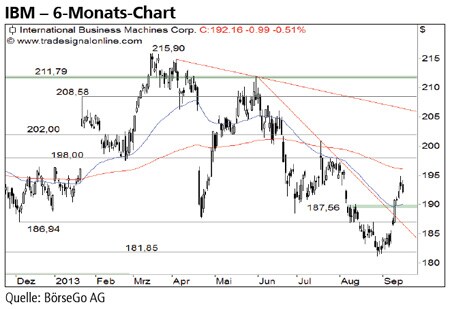 Rückblick: Die Aktien von IBM befinden sich seit der Ausbildungeines Zwischenhochs bei 211,79 USD im Oktober vergangenenJahres in einer breitangelegten Seitwärtsphase.