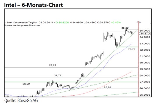 Ausblick: Auch nach einem Anstieg von über 50,00% seit dem Jahrestief wirken die Käufer bei den Aktien von Intel noch lange nicht müde. Ein Ausbruch aus der Flagge könnte direkt für neuen Schwung sorgen. Die Long-Szenarien: Steigt der Wert jetzt über 35,00 USD an, wäre die Flagge nach oben durchbrochen und mit einem Ausbruch über den Widerstand bei 35,20 USD zu rechnen. Im Anschluss an dieses Kaufsignal dürfte sich der Wert bis 36,78 und 37,00 USD nach oben arbeiten. Darüber stünde als Ziel die 38,50 USD-Marke auf der Agenda. Auf Sicht einiger Wochen wäre bei einem Anstieg über 38,50 USD bereits mit einer Kaufwelle bis 42,00 USD zu rechnen. Die Short-Szenarien: Der Bruch der kurzfristigen Aufwärtstrendlinie würde den Wert dagegen leicht unter Druck setzen. In diesem Fall könnte eine Gegenbewegung bis an die Haltemarke bei 33,40 USD führen, von der sich die Aktien wieder nach Norden orientieren dürften. Ein Rückfall unter die Marke würde dagegen zu einem Test der Unterstützung bei 32,39 USD führen. Erst unter dieser Marke wäre der Aufwärtstrend unterbrochen.
