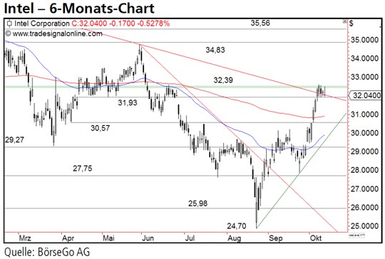 Ausblick: Die Aktien von Intel haben dank der massiven Erholung der letzten Wochen die Weichen für die Wiederaufnahme des langfristigen Aufwärtstrends gestellt. Die Long-Szenarien: Der vor kurzem gelungene Ausbruch über den Widerstand bei 31,93 USD könnte die Bullen jetzt weiter beflügeln und zu einem direkten Ausbruch über den Widerstand bei 32,39 USD führen. Doch auch eine kurzzeitige Korrektur bis an die 30,57 USD-Marke würde den Aufwärtsimpuls nicht in Frage stellen und anschliessend zu einem Angriff auf die Barriere bei 32,39 USD führen. Wird die Marke überwunden, hätten die Aktien von Intel zunächst Aufwärtspotenzial bis 34,83 USD. Dort wäre mit einer vorübergehenden Korrektur zu rechnen. Kann die Hürde im Anschluss ebenfalls durchbrochen werden, könnte der Wert mittelfristig sogar wieder bis 37,88 USD haussieren. Die Short-Szenarien: Erst bei einem Rückfall unter die Haltemarke bei 30,57 USD wäre der Aufwärtstrend gefährdet und eine Korrektur bis 29,27 USD und darunter bis an die 27,75 USDMarke die Folge. Dort sollten die Bullen wieder aktiv werden und die Rally fortsetzen. Brechen die Aktien dagegen auch unter die Marke ein, wäre ein Ausverkauf bis 24,70 USD möglich.