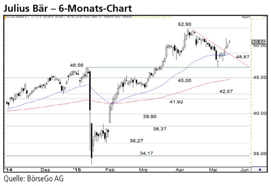 Rückblick: Das Jahr 2015 begann mit einem Paukenschlag für die Aktien von Julius Bär, denn im Rahmen des allgemeinen Markteinbruchs nach dem SNB-Entscheid zur EUR/CHF-Untergrenze fiel der Wert in einer geradlinigen Verkaufswelle von 46,56 CHF bis auf 33,77 CHF.