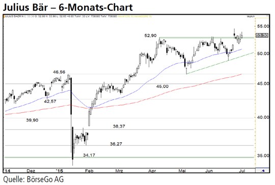 Ausblick: Die Aktien von Julius Bär befinden sich nach unserer Auffassung auf dem besten Wege, den massiven Aufwärtstrend der letzten Monate dynamisch fortzusetzen. Insbesondere im mittelfristigen Bild besitzt der Wert jetzt erhebliches Aufwärtspotenzial. Die Long-Szenarien: Ein Anstieg über das neue Rallyhoch bei 54,57 CHF könnte jetzt bereits den Startschuss für die Fortsetzung der Hausse liefern und die Aktien von Julius Bär bis 58,00 CHF und darüber direkt an den langfristigen Widerstand bei 58,95 CHF antreiben. Auf diesem Niveau könnte es zu einer zwischenzeitlichen Korrektur kommen. Sollte die Marke im Anschluss durchbrochen werden, stünde eine Ausweitung der Kaufwelle bis 65,00 CHF auf der Agenda. Mittelfristig wären zudem weitere Kurssteigerungen bis 70,00 CHF möglich. Die Short-Szenarien: Das jüngste Kaufsignal wäre erst für den Fall wieder neutralisiert, dass der Wert unter die kurzfristige Aufwärtstrendlinie auf Höhe von 50,00 CHF einbrechen würde. In diesem Fall käme es zu Abgaben bis 48,81 CHF, die sich unterhalb dieser Marke direkt bis 46,56 CHF ausweiten dürften. An dieser Stelle könnte eine erneute Aufwärtsbewegung einsetzen. Würde dagegen auch diese Unterstützung gebrochen, käme es zu einem Ausverkauf bis 41,92 CHF.
