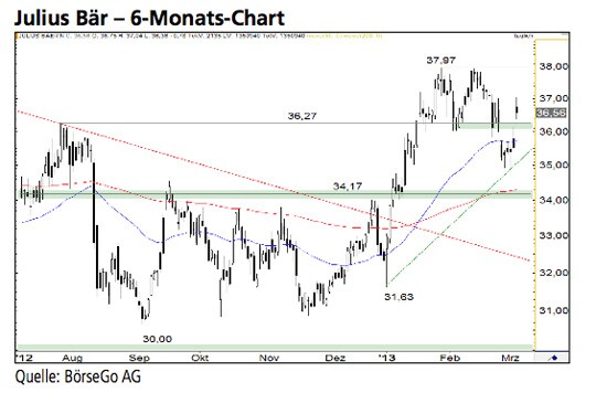 Der Gegenschlag der Bullen hätte nicht dynamischer ausfallen können und könnte jetzt dazu genutzt werden, das Doppelhoch zu überwinden und damit ein weiteres Kaufsignal zu aktivieren. Die Long-Szenarien: Brechen die Aktien von Julius Bär im Rahmen der laufenden Kaufwelle über 37,97 CHF aus, wäre die Korrekturphase beendet. Entsprechend könnte man einen nachhaltigen Anstieg über diese Hürde mit einem Long-Engagement handeln. In der Folge dürften die Aktien kurzfristig bis 39,67 CHF ansteigen. Aufgrund der aktuellen Stärke wäre sogar ein vorübergehender Kurssprung bis 40,30 CHF möglich, ehe es zu einer leichten Korrektur kommen dürf- te. Sollte die Marke im weiteren Verlauf ebenfalls überwunden werden, könnte der Wert auf mittlere Sicht bereits bis 45,00 CHF haussieren. Die Short-Szenarien: Fallen die Aktien dagegen unter die Unterstützung bei 36,27 CHF zurück, dürfte sich die Korrekturphase ausdehnen und ein zweiter Test der Unterstützung bei 34,90 CHF folgen. Von dort aus dürfte sich der Aufwärtstrend jedoch fortsetzen. Würde diese markante Unterstützung dagegen unterschritten, könnte nurmehr die 34,17 CHF-Marke einen Ausverkauf bis 31,63 CHF verhindern.