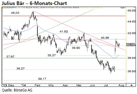 Ausblick: Der Befreiungsschlag der Bullen kam zum richtigen Zeitpunkt und mit durchschlagendem Erfolg: die Abwärtstendenz der Aktien von Julius Bär wurde erfolgreich gestoppt und direkt weiteres Aufwärtspotenzial gebildet. Die Long-Szenarien: Nach Abschluss der laufenden leichten Gegenbewegung dürften die Aktien zunächst ein zweites Mal an den Widerstand bei 40,96 CHF ansteigen. Aufgrund der hohen Trenddynamik dürfte dieser gebrochen werden und sich die Rally bis an die nächsthöhere Hürde bei 41,92 CHF fortsetzen. Diese Marke dürfte die Bullen vor eine harte Probe stellen. Sollte es ihnen dennoch gelingen, die Barriere zu überwinden, käme es zu einem weiteren Kaufsignal. In der Folge könnte sich die Hausse mittelfristig bis 45,00 CHF ausdehnen. Die Short-Szenarien: Setzt der Wert dagegen deutlicher unter 39,00 CHF zurück, sollte eine mehrtägige Korrektur zu einer Abwärtsbewegung bis 37,97 CHF führen. An dieser Stelle dürften die Käufer jedoch wieder in das Geschehen eingreifen und die Aktien von Julius Bär wieder in Richtung der 40,96 CHF-Marke antreiben. Dagegen wäre ein Ausverkauf unter 37,97 CHF bearish zu werten. In diesem Fall wäre die steile Erholung neutralisiert und mit einem Rückfall an die Unterstützung bei 36,27 CHF zu rechnen.