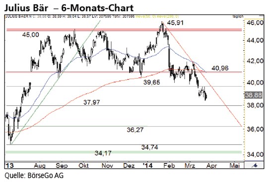 Ausblick: In Kürze werden die Aktien auf einen wichtigen langfristigen Unterstützungsbereich auftreffen. Hier müssen die Bullen das Ruder wieder herumreissen. Ansonsten dürfte schon bald die nächste Abwärtswelle anrollen. Die Long- Szenarien: Im Detail richtet sich der Blick auf die Marken bei 38,30 und 37,97 CHF. Diese sollten zumindest für eine kurzfristige technische Erholung sorgen. Allerdings notiert bereits bei 39,65 CHF ein Kreuzwiderstand im Chart, an dem sich die Bullen die Hörner abstossen könnten. Erst wenn sie diese Hürde hinter sich lassen können, wäre ein Rücklauf an den massiven Widerstand bei 40,96 CHF möglich. Spätestens dort wäre allerdings mit erheblichem Widerstand seitens der Bären zu rechnen. Die Short-Szenarien: Findet sich auf Höhe der Unterstützungen um 38,00 CHF hingegen kein ausreichendes Kaufinteresse, dürften die Aktien ihre Abwärtstendenz auch in den kommenden Wochen fortsetzen. Nennenswerte Unterstützungen lassen sich für diesen Fall im Chart erst wieder bei 36,27 und 35,30 CHF nennen. Bei rund 35,30 CHF verläuft der massgebliche langfristige Aufwärtstrend des Titels.