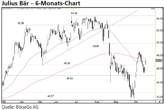 Rückblick: Eine steile mittelfristige Kaufwelle ebbte bei den Aktien von Julius Bär bei 54,55 CHF im Juli dieses Jahres ab und der Wert bildete ein bearishes Mehrfachhoch aus.