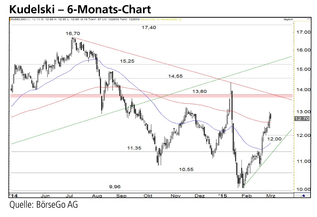 Ausblick: Die Aktien von Kudelski haben kurzfristig weiteres Aufwärtspotenzial. Der übergeordnete Abwärtstrend ist jedoch weiterhin intakt und dürfte sich nach dem Ende der Erholung fortsetzen. Die Short-Szenarien: Zunächst könnten die Aktien bis an die 13,20 CHF-Marke steigen. Darüber würde der starke Kreuzwiderstand bei 13,80 CHF angesteuert. Auf Höhe der mittelfristigen Abwärtstrendlinie sollten die Bären jedoch spätestens wieder aktiv werden und für einen Kursrückgang bis 12,00 CHF sorgen. Wird die Marke ebenfalls unterschritten, wäre ein Verkaufssignal gebildet und ein Ausverkauf bis 11,35 CHF die Folge. Kann auch diese Unterstützung nicht zu einer Stabilisierung genutzt werden, dürfte ein Einbruch bis 9,96 CHF folgen. Die Long-Szenarien: Erst bei einem nachhaltigen Anstieg über die Barriere bei 13,80 CHF hätten die Bullen wieder die besseren Karten. In der Folge könnte der Wert bis 14,55 CHF klettern. Ein anschliessender Ausbruch über diese Hürde hätte ein Kaufsignal zur Folge. Kurzfristig dürften die Aktien von Kudelski in diesem Fall bis 15,25 und 16,00 CHF haussieren.