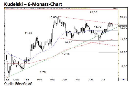 Aktuell haben die Käufer aus unserer Sicht beste Chancen, die Flagge nach oben zu verlassen. Damit würde ein mittelfristiges Kaufsignal gebildet. Die Long-Szenarien: Ober- halb der Unterstützung bei 11,75 CHF ist ein Ausbruch über den Widerstandsbereich bei 12,50 CHF sehr wahrscheinlich und würde zu einer Kaufwelle führen, die die 13,50 CHF- Marke rasch hinter sich lassen dürfte. Im Anschluss könnte der Wert bis 13,80 CHF ansteigen. Sollte auch diese massive Hürde durchbrochen werden, könnte sich die Rally bis 14,70 CHF fortsetzen. Selbst eine Ausdehnung bis 15,70 CHF ist in diesem Fall mittelfristig denkbar. Die Short-Szenarien: Im der- zeit wieder bullishen Umfeld würde erst ein Kursrutsch unter die 11,75 CHF-Marke für Abgabedruck und eine ausgeprägte Korrektur bis 11,35 CHF sorgen. An dieser soliden Unterstützung wäre jedoch mit einer Stabilisierung und einem weiteren Anstieg zu rechnen. Brechen die Aktien von Kudelski dagegen unter die Marke ein, wären Verluste bis 10,15 CHF die Folge.