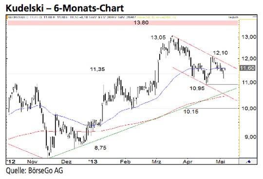 Knapp unterhalb der steilen kurzfristigen Abwärtstrendlinie ist bei den Aktien von Kudelski aktuell bullisher Druckaufbau zu verzeichnen. Ein Ausbruch aus der Flaggenformation könnte in Kürze zu einer weiteren Kaufwelle führen. Die Long-Szenarien: Steigt der Wert über den kleinen Widerstand bei 11,80 CHF an, wäre die Flagge ebenfalls durchbrochen. Dieses Kaufsignal würde durch einen Anstieg über 12,10 CHF bestätigt und könnte eine direkte Aufwärtsbewegung bis 13,05 CHF nach sich ziehen. Würde im weite- ren Verlauf auch diese Barriere überwunden, könnte der Wert auf mittlere Sicht bis 13,80 CHF und darüber bereits bis 14,75 CHF haussieren. Die Short-Szenarien: Im derzeit stark bullishen Umfeld wäre erst ein Bruch der Kreuzunterstützung bei 10,95 CHF ein Zeichen für eine Fortsetzung der laufenden Korrektur. In diesem Fall dürften die Aktien von Kudelski zunächst bis 10,15 CHF zurücksetzen. Ausgehend von dieser Marke könnte sich der Aufwärtstrend jedoch bereits wieder fortsetzen. Ein Ausverkauf unter diese Unterstützung hätte dagegen ein Verkaufssignal zur Folge. In diesem Fall wäre mit mittelfristigen Verlusten bis 8,75 CHF zu rechnen.