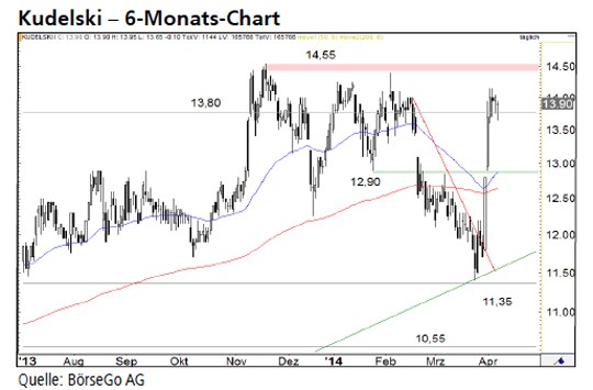 Ausblick: Der steile Aufwärtsimpuls der letzten Woche hat die Ambitionen der Käuferseite eindrucksvoll aufgezeigt. Die Fortsetzung des langfristigen Aufwärtstrends dürfte in Kürze anstehen. Die Long-Szenarien: Verbleibt der Wert oberhalb von 13,80 CHF, dürfte sich die Kaufwelle direkt bis 14,55 CHF fortsetzen. Diese starke Barriere könnte anschliessend eine erste Korrektur auslösen. Nach einer solchen Gegenbewegung dürfte es jedoch aufgrund der aktuellen Trendstärke zu einem Ausbruch über die Marke kommen, der die Aktien bis 15,70 CHF und darüber auf 16,65 CHF katapultieren dürfte. Die Short-Szenarien: Sollte der Wert jetzt wider Erwarten Schwäche zeigen und unter die Unterstützung bei 13,30 CHF zurücksetzen, käme es zu einer leichten Korrektur bis an die Haltemarke bei 12,90 CHF. An dieser Unterstützung sollte es zu einer Trendwende und einem weiteren starken Aufwärtsimpuls kommen. Brechen die Aktien von Kudelski dagegen unter die Marke ein, wäre der Anstieg der letzten Tage neutralisiert und ein Ausverkauf bis 11,35 CHF die Folge.