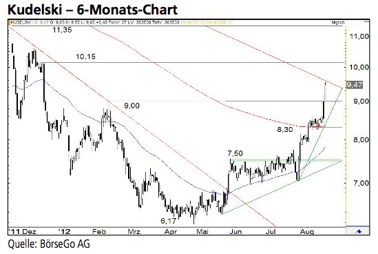 Ausblick: Der Wert erscheint aus unserer Sicht auf dem aktu- ellen Niveau etwas überkauft und eine kurzzeitige Korrektur wahrscheinlich. Unabhängig davon könnte sich der laufende Aufwärtsimpuls bei einem Ausbruch über die Abwärtstrendlinie unvermindert fortsetzen. Die Long-Szenarien: Nach einer Zwischenkorrektur bis 9,00 CHF könnte es zu einem Anstieg über den Widerstand bei 9,50 CHF kommen. In der Folge dieses Kaufsignals könnte der Wert bereits bis 10,15 CHF ansteigen. Würde auch diese Barriere gebrochen, kann eine mittelfristige Hausse bis 11,35 CHF führen. Die Short-Szenarien: Setzen die Aktien von Kudelski dagegen auf Tagesschlusskursbasis un- ter 9,00 CHF zurück, könnte es nach einer Korrektur bis 8,30 und 8,00 CHF zu einem weiteren Anstieg kommen. Erst ein Bruch der Unterstützung bei 8,00 CHF würde das Chartbild eintrüben und eine deutliche Gegenbewegung bis 7,50 CHF auslösen. Darunter sind Abgaben bis 7,05 CHF und damit ein Rückfall in den Seitwärtsmarkt des Frühjahrs möglich.