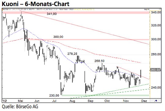 Rückblick: Nach einem Doppelhoch im Mai 2012 bei 341,00 CHF brachen die Aktien von Kuoni bis zum Juli diesen Jahres auf 232,00 CHF ein. Eine dort einsetzende...