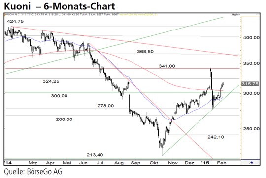 Rückblick: Bis Oktober des vergangenen Jahres befanden sich die Aktien von Kuoni in einer steilen Abwärtsbewegung, die weite Teile des vorherigen, mehrmonatigen Anstiegs wieder zunichte gemacht hatte.