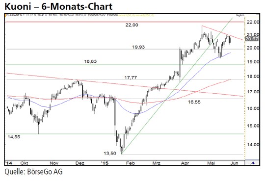 Rückblick: In einer steilen Abwärtsbewegung waren die Aktien von Kuoni ab Januar 2014 bis in den Bereich der langfristigen Unterstützung bei 213,40 CHF eingebrochen, ehe die Bullen im Oktober letzten Jahres zu einem starken Konter ansetzten.