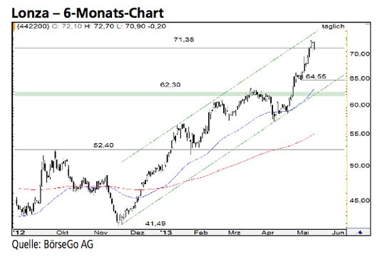 Auch nach einer Kursverdoppelung seit dem Aus- verkaufstief des Jahres 2012 zeigen die Bullen bei den Aktien von Lonza keine Spur von Schwäche. Die Oberseite des Aufwärtstrendkanals könnte die Hausse aus unserer Sicht zwar kurzfristig eindämmen, ein Ende des Aufwärtstrends ist derzeit jedoch nicht absehbar. Die Long-Szenarien: Sollte der Wert im Rahmen der aktuellen Konsolidierung oberhalb der kleinen Unterstützung bei 69,35 CHF verbleiben, wäre dies ein klares Anzeichen für eine baldige Fortsetzung der Hausse. Sie dürfte die Aktien zunächst bis 76,50 CHF führen. Darüber wäre der Widerstand bei 82,20 CHF als kurzfristiges Ziel zu nennen. Sollte diese Marke ebenfalls durchbrochen werden, könnten die Bullen die Aktien auf mittlere Sicht bis an die markante Kurshürde bei 90,95 CHF antreiben. Die Short-Szenarien: Ein deutlicher Rückfall unter 69,35 CHF würde kurzzeitig zu einer Ausweitung der Korrekturphase und Abgaben bis zur Unterstützung bei 64,55 CHF führen. An dieser Stelle würden die Aktien zusätzlich durch die Unterseite des Aufwärtstrendkanals gestützt und könnten von dort aus ihren Höhenflug fort- setzen. Entsprechend bearish wäre hingegen ein Bruch dieser Kreuzunterstützung zu werten. In diesem Fall wäre ein kleines Verkaufssignal mit Zielen bei 62,30 und 58,45 CHF aktiviert.