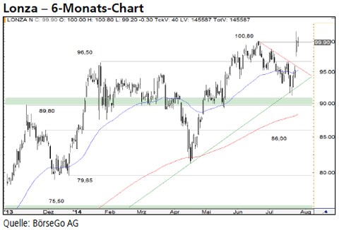 Nachdem diese Kaufwelle auf ein Verlaufshoch bei 96,50 CHF geführt hatte, kam es zu einer scharfen Korrektur, die die Aktien von Lonza an die langfristige Aufwärtstrendlinie zurückführte. Hier griffen die Bullen allerdings wieder in das Geschehen ein und sorgten für einen weiteren steilen Anstieg. In dessen Verlauf wurde auch das Hoch bei 96,50 CHF überschritten und der Anstieg bis 100,80 CHF geführt. Seit Ende Juni setzte der Wert zu einer bullishen flaggenförmigen Korrektur an, die ihn an die Kreuzunterstützung bei 90,95 CHF drückte. Doch mit dem Ausbruch über die kurzfristige Abwärtstrendlinie und dem dynamischen Anstieg über den Widerstand bei 96,50 CHF meldeten sich die Bullen in der letzten Woche eindrucksvoll zurück. Dieses Kaufsignal sorgte für Folgekäufe, die die Aktien von Lonza bereits kurzzeitig über die 100,80 CHF-Marke ausbrechen liessen.