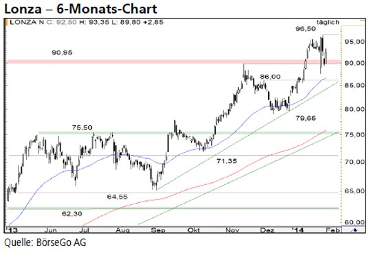 Rückblick: Seit dem Tief des Juni 2012 befinden sich die Aktien von Lonza in einem enorm steilen Aufwärtstrend, der den Wert im Mai letzten Jahres über den Widerstand bei 71,35 CHF führte.