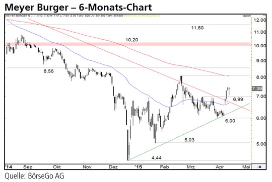 Ausblick: Die übergeordnete Baisse der Aktien von Meyer Burger ist weiterhin dominant. Dennoch bieten sich jetzt kurzfristige Aufwärtschancen. Die Long-Szenarien: Sollte sich der Wert jetzt über der 6,99 CHF-Marke etablieren, wäre ein direkter Anstieg an den Widerstand bei 8,10 CHF die Folge. Gelingt den Bullen auch der Bruch dieser Hürde, wartet bei 8,56 CHF bereits der nächste potentielle Wendepunkt der Erholung. Dort wäre eine Korrektur entsprechend wahrscheinlich. Ein Ausbruch über diesen Widerstand würde dagegen ein Kaufsignal generieren und zu einer Aufwärtsbewegung bis 10,20 CHF führen. Die Short-Szenarien: Bei einem Ausverkauf unter die 6,99 CHF-Marke wäre die laufende Erholung unterbrochen. In diesem Fall dürfte der nächste Anstieg erst nach einem Rücklauf an die Unterstützung bei 6,00 CHF erfolgen. Wird diese Marke jedoch unterschritten, hätten die Bären ein Verkaufssignal gebildet und den Abwärtstrend wieder aufgenommen. In der Folge dürften die Aktien von Meyer Burger erneut bis an das Verlaufstief bei 4,44 CHF einbrechen.