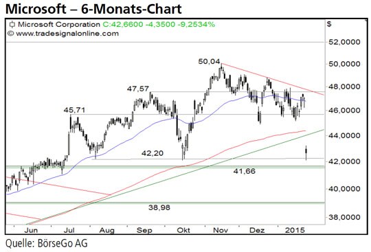 Ausblick: Kurzfristig erscheinen die Aktien von Microsoft überverkauft, weshalb eine Erholung möglich ist. Allerdings ist am gestrigen Dienstag einiges an Porzellan im Chart zerschlagen worden. Dieses wieder zu reparieren, dürfte alles andere als leicht fallen. Die Short-Szenarien: Im Fokus steht in den kommenden Tagen die zentrale Unterstützung bei 42,20 USD. Ebben die Verkaufswellen nicht ab und wird diese Marke deutlich unterboten, sind weitere Kursverluste in Richtung der massiven langfristigen Unterstützung bei 37,50 USD die wahrscheinlichste Variante. Ein Etappenziel auf dem Weg dorthin lässt sich bei 38,98 USD nennen. Im Bereich von 37,50 USD hätten die Aktien gute Chancen, wieder in einen Aufwärtstrend einzubiegen. Misslingt allerdings auch dies, wäre die nächste Unterstützung erst wieder bei 35,78 USD auszumachen. Die Long-Szenarien: Sollte der Wert wider Erwarten den ehemaligen Aufwärtstrend bei aktuell rund 44,50 USD zurückerobern können, dürfte das Schlimmste auf der Unterseite überstanden sein. Die Marke von 45,71 USD wäre in diesem Fall das nächste logische Ziel. Ein Anstieg auch über diese Barriere würde für zusätzliche Entspannung sorgen und Kurspotenzial bis zur Horizontalen bei 47,57 USD eröffnen.