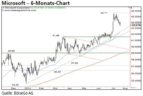 Ausblick: Mit dem Ausbruch über den Widerstand bei 41,66 USD haben die Bullen bei Microsoft ein mittelfristiges Kaufsignal generiert. Selbst nach dem starken Anstieg ist das Aufwärtspotenzial der Aktien aus unserer Sicht noch nicht ausgereizt. Die Long-Szenarien: Die laufende Korrektur dürfte jetzt im Bereich von 43,00 USD wieder auf Käufer treffen und anschliessend ein Anstieg an das bisherige Rallyhoch bei 45,71 USD erfolgen. Bei einem Ausbruch über diese Barriere könnte sich die Hausse direkt fortsetzen und sich bis 47,50 und 48,00 USD ausdehnen. Steigen die Aktien anschliessend auch über diesen rechnerischen Zielbereich an, wäre bereits mit einer Rallyausweitung bis 52,00 USD zu rechnen. Die Short-Szenarien: Setzt der Wert dagegen jetzt unter 43,00 USD zurück, käme es zu einem Rücklauf an das frühere Hoch bei 41,66 USD. Zwar wäre der Ausbruch und der übergeordnete Aufwärtstrend damit noch nicht gefährdet, die bullishe Verfassung des Wertes hätte jedoch einen Dämpfer erhalten. Dennoch wäre ausgehend von 41,66 USD mit einem weiteren Anstieg zu rechnen. Sollte es dagegen zu einem Bruch dieser Marke kommen, sollte man einen Ausverkauf bis 38,98 USD erwarten.